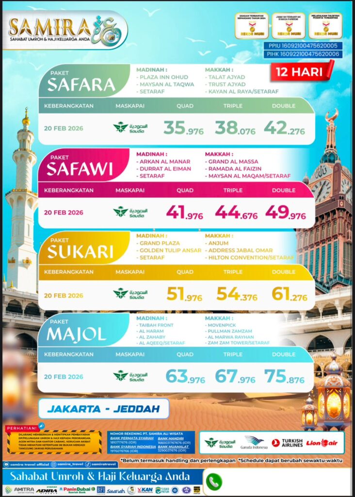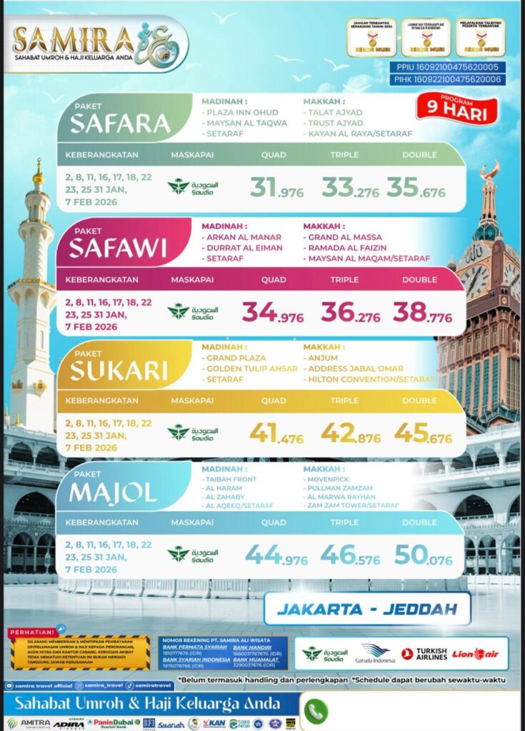 Samira Travel terdaftar resmi di Kementerian Agama, telah memberangkatkan ribuan jamaah, dan mendapatkan banyak testimoni positif dari jamaah. Kepercayaan yang kami dapat kami bangun dari transparansi biaya, kejelasan jadwal, dan komitmen dalam menjaga kenyamanan dan keamanan jamaah.