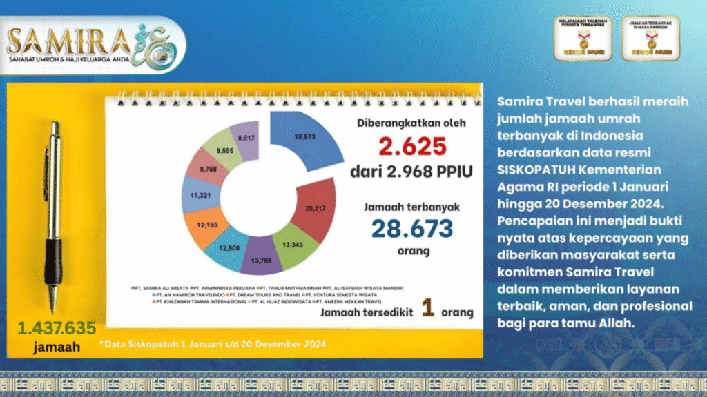 Ya, Samira Travel mencatatkan sejarah luar biasa sebagai peraih Rekor MURI untuk jumlah keberangkatan jamaah umroh terbanyak di masa pandemi. Bukan hanya bertahan, Samira Travel melesat menjadi pelopor kebangkitan umroh Indonesia — dan hingga tahun 2025 ini, tetap kokoh sebagai travel umroh nomor satu dengan jamaah terbanyak secara nasional.